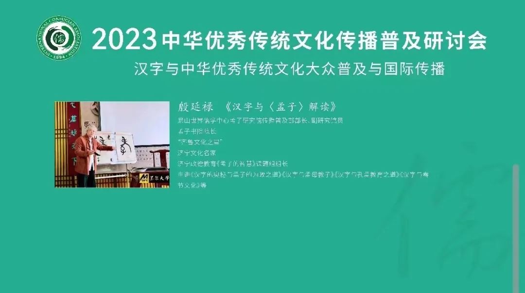 11月20日至21日,應國際儒聯秘書處邀請,我院傳承普及部部長、副研究館員殷延祿,參加“2023年中華優秀傳統文化傳播普及研討會”(主題:漢字與中華優秀傳統文化大眾普及與國際傳播),并作《漢字與<孟子>解讀》主旨發言。