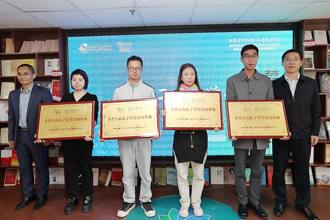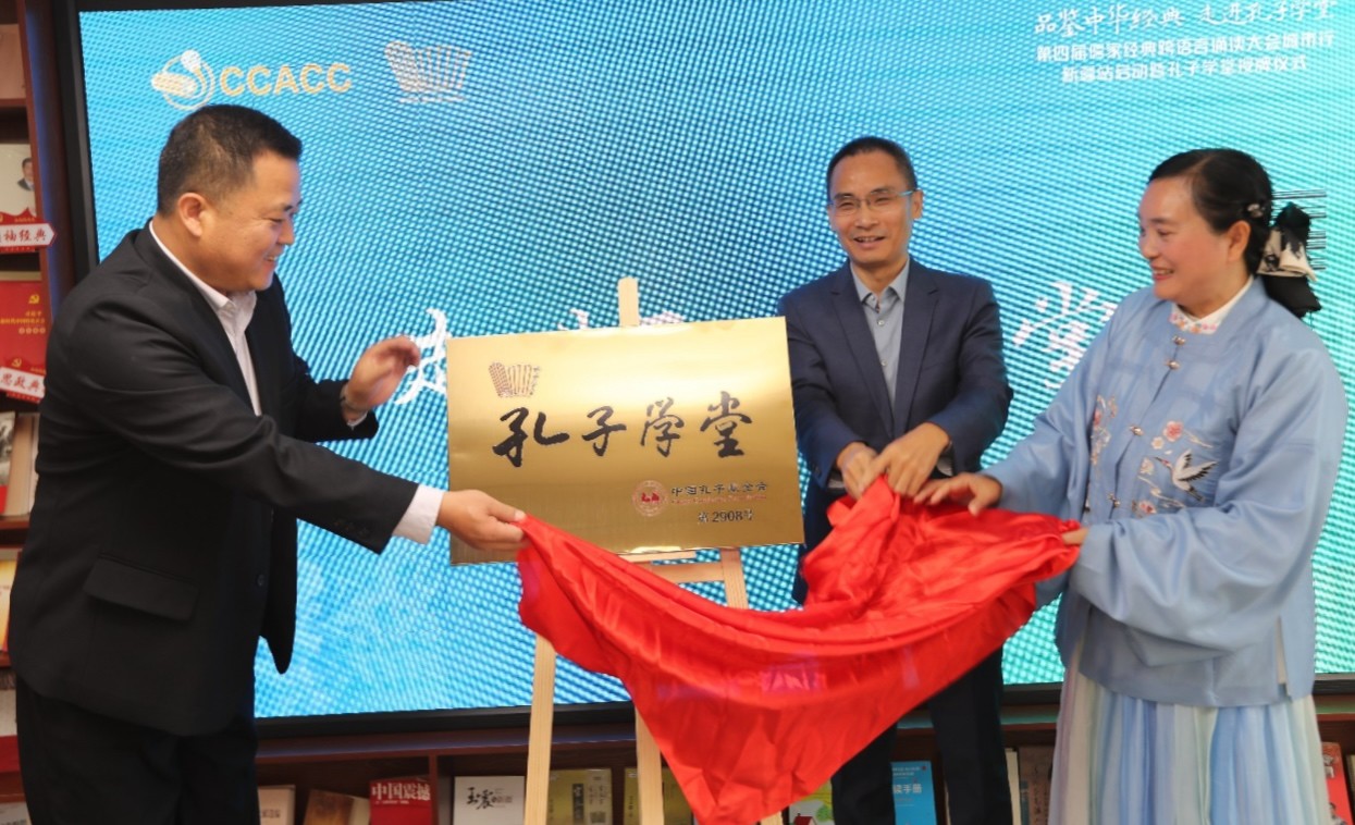 中國孔子基金會孔子學堂推進委員會副主任孫潤來宣讀了關于成立書香天山科技有限公司孔子學堂的批復函,并與韜奮基金會閱讀組織聯合會理事、新疆書香天山文化科技有限公司黨組織書記、總經理韓芝雄、全民閱讀推廣人、全國十佳播音主持教師、新疆書香天山科技有限公司副總經理、書香天山科技有限公司孔子學堂負責人何志涓共同為孔子學堂揭牌。